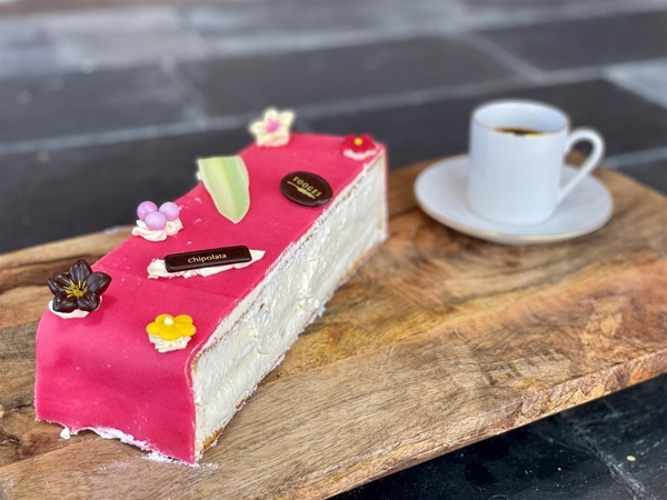 Deze Chipolata stam is gemaakt van Moscovische cake met een luchtige Zwitserse room, rum, rozijnen en afgedekt met een laagje marsepein.